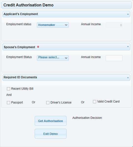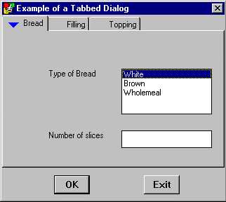 The run time user can press the tabs at the top for Bread, Filling and Topping in order to switch between the three overlaid pages being used here. Controls (buttons, list boxes, etc.,) on pages are created, edited and used in just the same way as with normal dialogs. However, an important difference is that you can set your controls to appear on one tab page, or on the common area outside of the tab pages frame. In this example, the list input control for Bread is just placed on this top page for bread, while the OK and Exit button controls are below the lower extremity the tab control.