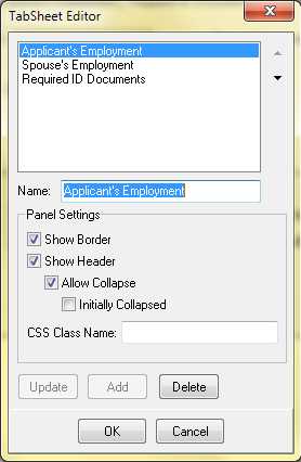 Name: The name for the panel can include html, for example <div class="ui-icon ui-icon-info" style="float:left"></div>Applicant's Employment will produce the header