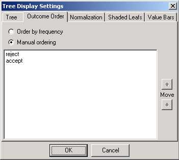 Specify the order in which discrete value outcomes appear at each tree leaf. You can set this to Order by frequency, i.e. the values with highest frequency will appear sorted from the top - for each leaf node. Manual ordering enables you to impose a single order for all leaf nodes.