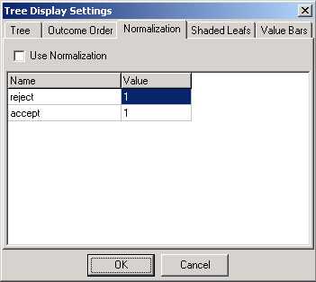 For example, consider a bank wishing to analyse a database of customers who obtained loans. If the percentage of customers who subsequently defaulted on the loans is for example 5%, then a random sample of 5000 records will only contain some 250 defaulting records, which may prevent the tree from growing very far. If the number of defaulters is to be increased to 2500 then the size of the overall sample will have to be around 50000 examples. Whatever way a biased sample is obtained, the percentage size and probability/rate figures can then be normalised for each data source to reflect the true ratio in the domain by using the Normalisation function. Here, each outcome can be associated with a sampling factor. For example, if the true number of records with a certain outcome is 30000 and in the training sample used it is 2000, then the sampling factor (or multiplier) is 15.00. Note that normalisation will only take effect if the Use Normalisation box is checked. The normalisation process effects the following: