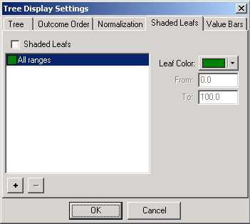 The color intensity represents the outcome percentage and is relative to the range of the highest and lowest values in the current tree profiles. i.e. If your highest outcome was 65%, then this will appear as a bar of total color, while your lowest of 34% would have no color. You can also apply different colors to different ranges and click on , the Leaf Shade Legend icon, to add a window showing the range settings.