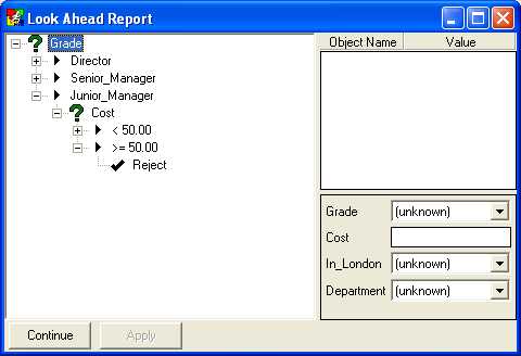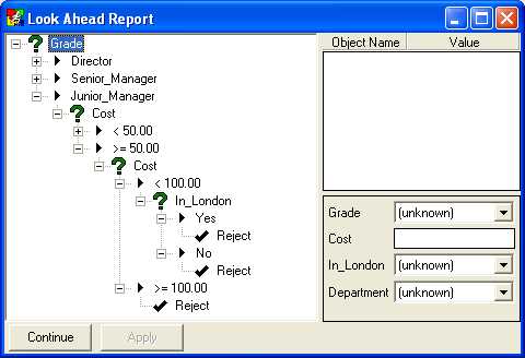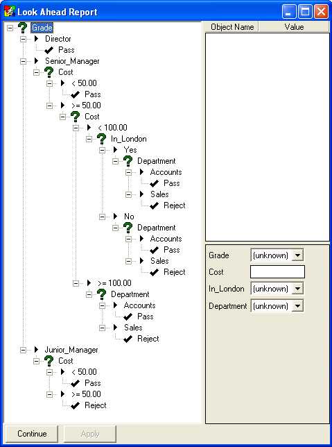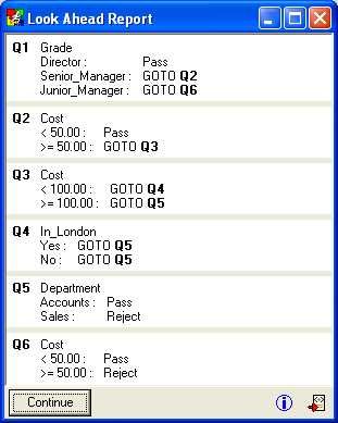 The LookAheadReport command will display a report that 'looks ahead' through the knowledge of the object specified. The report shows only the objects/values that haven't been determined yet. The report is either shown as a series of questions or as a graphical tree, depending on the Boolean value of the <show as tree> parameter. If the <compress> parameter is set to True then the report will be refined shortening branches which lead to the same outcome.