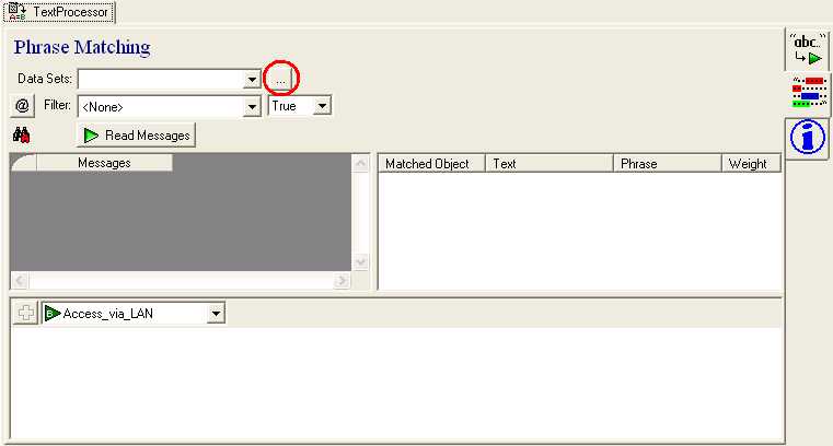 Using this button Data Sets can be added or updated so that the phrase matching or text processing can be developed, tested and refined. Data Sets are based on the developer's previously defined ODBC data sources. An ODBC data sources is linked to a database usually containing a table of example 'messages'.