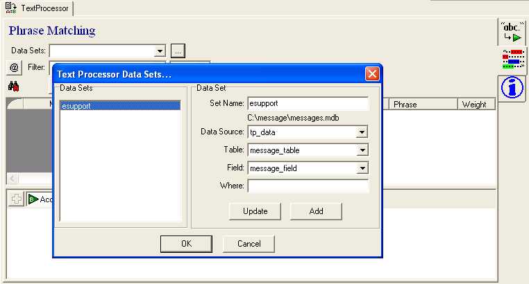 A TextProcessor Data Set is defined by a chosen Data Set Name, an ODBC Data Source, the Table within that Data Source, and the Field within that Table in which the messages lie. The 'Where' input box allows the messages to be filtered using standard SQL expressions.