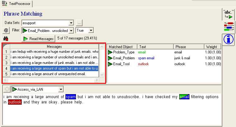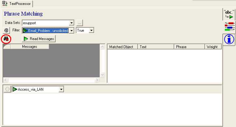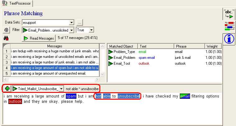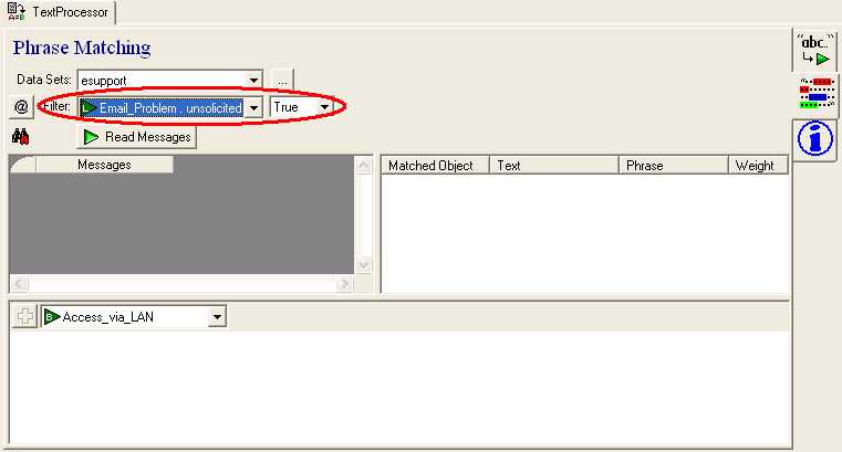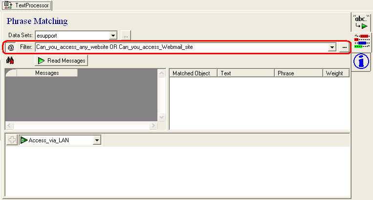 The Filter drop down list boxes allows any of the defined Objects from the Object Phrases Tab and either True or False to be selected. This allows the messages contained in the chosen Data Set to be tested to see if the text expressions associated with the selected Object are present (True) or not present (False).