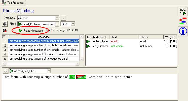 The Read Messages Button will read the messages in the chosen data set and list all the messages in the Messages Window that have satisfied the filtering criteria. It will show the number of messages that met the filtering criteria and the total number of messages in the Data Set (also expressed as a percentage).