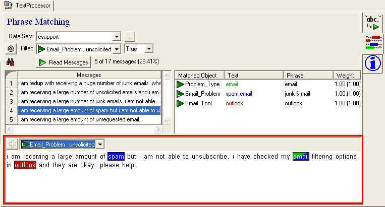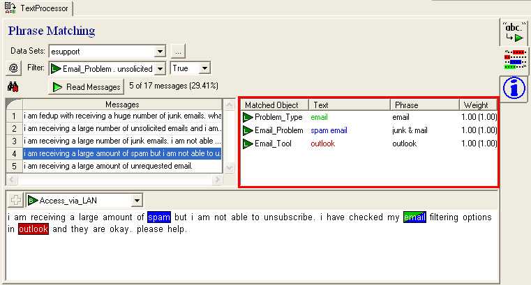 The Matched Objects Window shows the results for the highlighted message in the Messages Window. It lists the Objects that were matched by the text expressions that were found and the associated phrase that led to the text expression. The weight of phrase match is shown as well as the weight of the Object match in brackets (amalgamated weight of all the phrase matches of that Object in that message). The weight of the Object is also copied to the fuzzyValue property of the Object. The colour coding of the text expressions helps locate the actual text in the Message Analysis Window.
