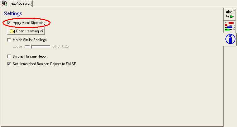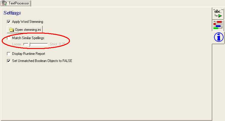 This option when checked will adjust the spelling in the message (using a trigram algorithm) purely for matching purposes during the text processing operation. 'Loose' will result in the contents of the message being varied significantly whereas 'strict' will result in the contents of the message being varied slightly. 'Loose' may pickup more spelling mistakes in the message but could lead to more matches than is desirable. This option applies to the runtime and the design time Phrase Matching Tab.