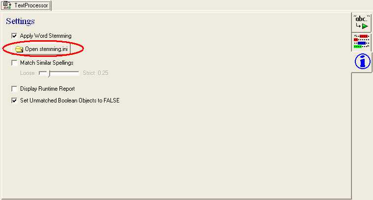 This button opens the 'stemming.ini' file which is where the user can define additions to the internal stemming table. The entries in this file should be in the following format with each entry on a new line.