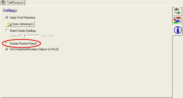 This option when checked will produce a report at runtime showing the Objects that were matched during the text processing operation and the weights those Objects achieved. This can also be switched on or off at runtime using the 'showReport' property of the TextProcessor Object.