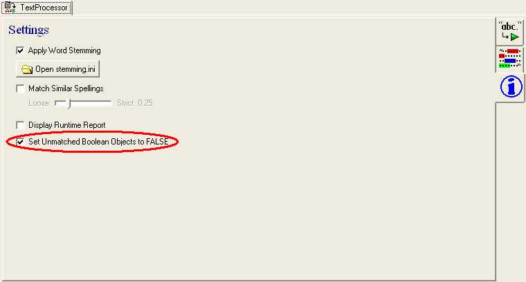 This option, when checked, will set all the unmatched Objects to False at runtime after the TextProcessor has been used with the @Do command. This option does not have any effect on the Phrase Matching Tab.