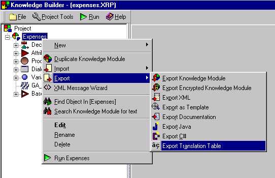 To create a translation table for a knowledge module place the focus on the knowledge module name and use the right-click menu 'Export / Export Translation Table'.