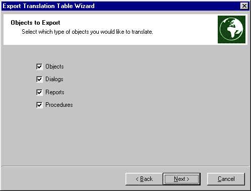 Select the type of objects that require translation. For objects the wizard would be interested in the Object Control Properties and Instance Properties that had the Translate checkbox checked. For dialogs the wizard would be interested in all string properties of the dialog and its controls. For reports the wizard would be interested in the contents of the report. For procedures the wizard would be interested in any string literals that reside between the commands @BeginTranslate and @EndTranslate.